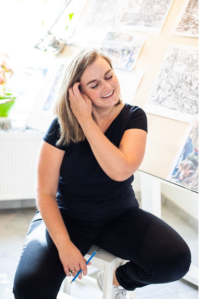 Tille Pepermans’ technique is defined by an interplay between darkness and light. She uses a 6B pencil to create detailed images in a manneristic style. Contrasts are crucial in her works. Her busy and lively compositions acquire rhythm through the interplay of darkness and light. She invites the viewer to actively wonder trough her work and to discover every detail. Every image is a graphic universe.