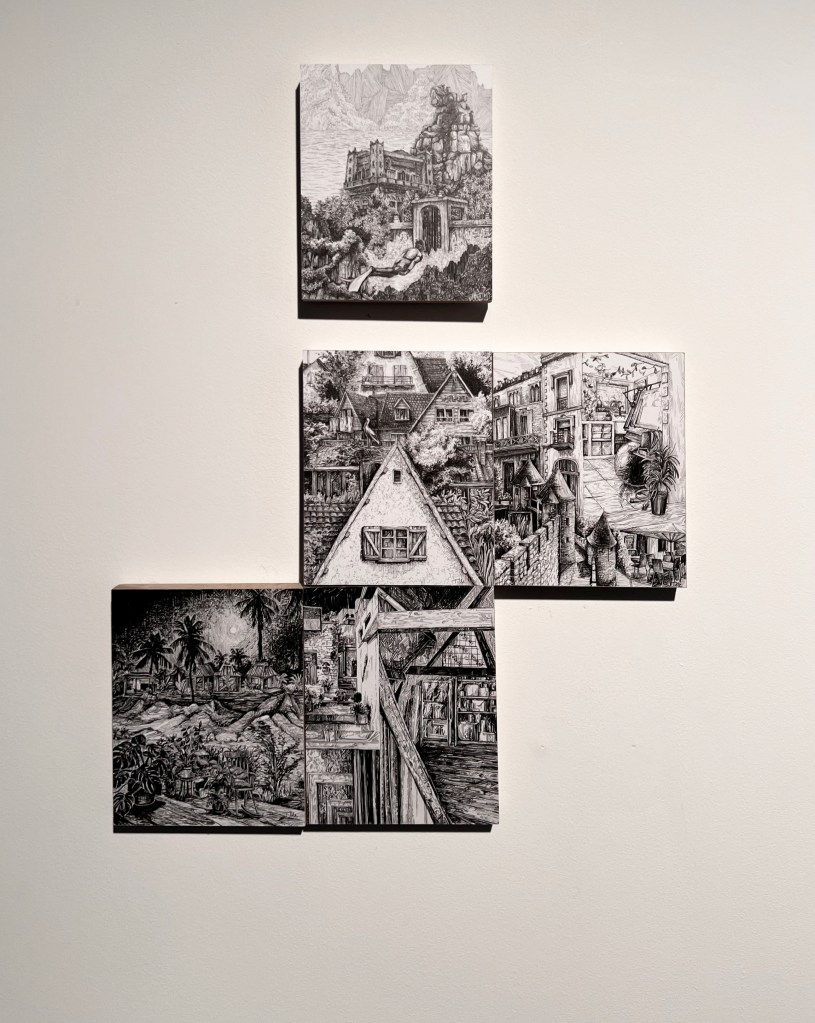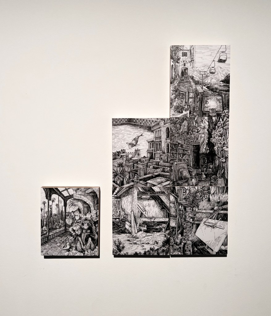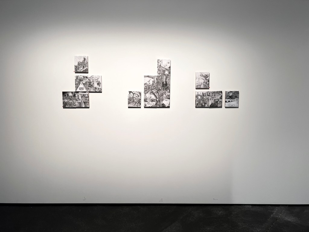 Small drawings (18/14 cm) on wooden blocks. Each project starts with a series of photo collages. What happens if I incorporate this way of working into my final drawings? Can a small, isolated drawing turn into a detail of a larger work?